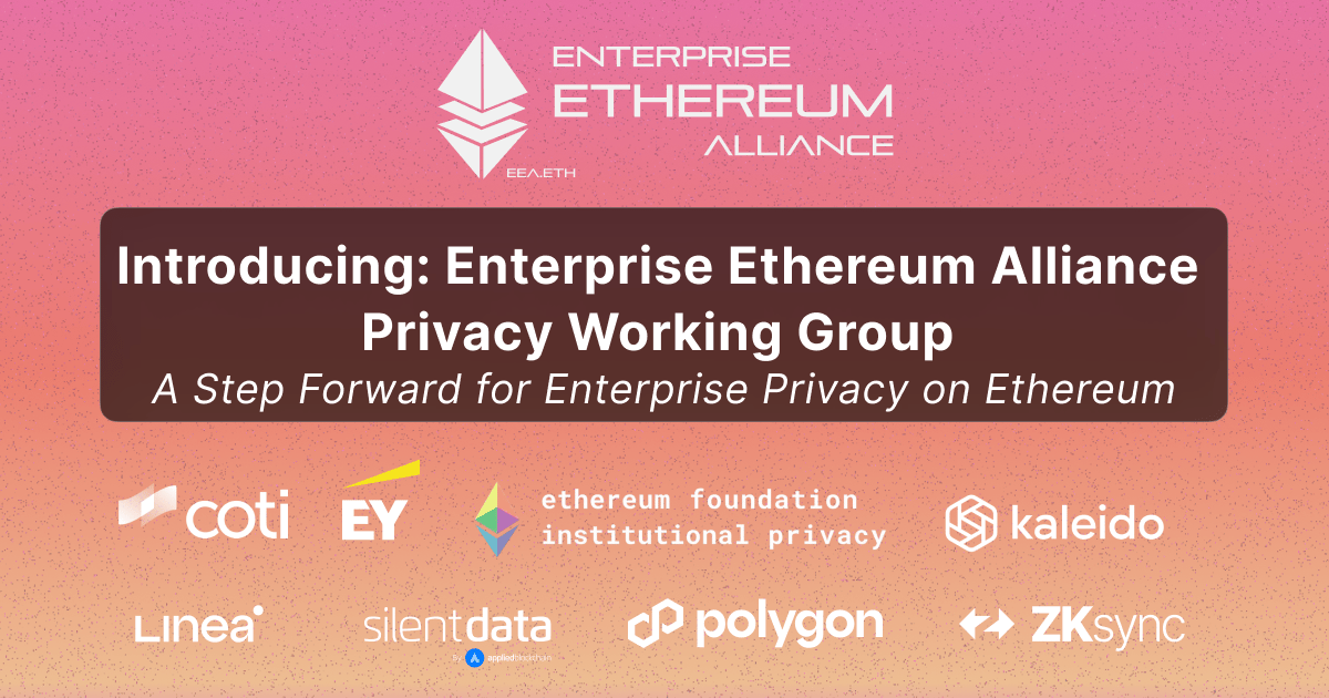 The EEA Privacy Working Group brings together eight initial contributors: Applied Blockchain (Silent Data), Consensys (Linea), COTI, EY (Nightfall), Polygon, Kaleido (Paladin), ZKsync, and Ethereum Foundation to map the current landscape of enterprise-relevant privacy solutions across Ethereum and L2 networks.